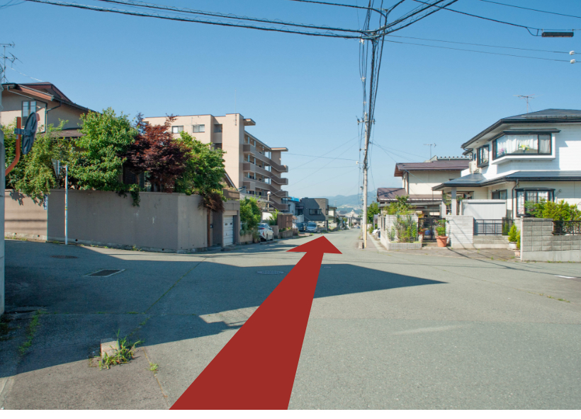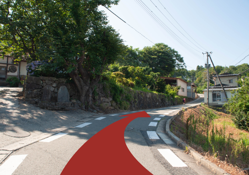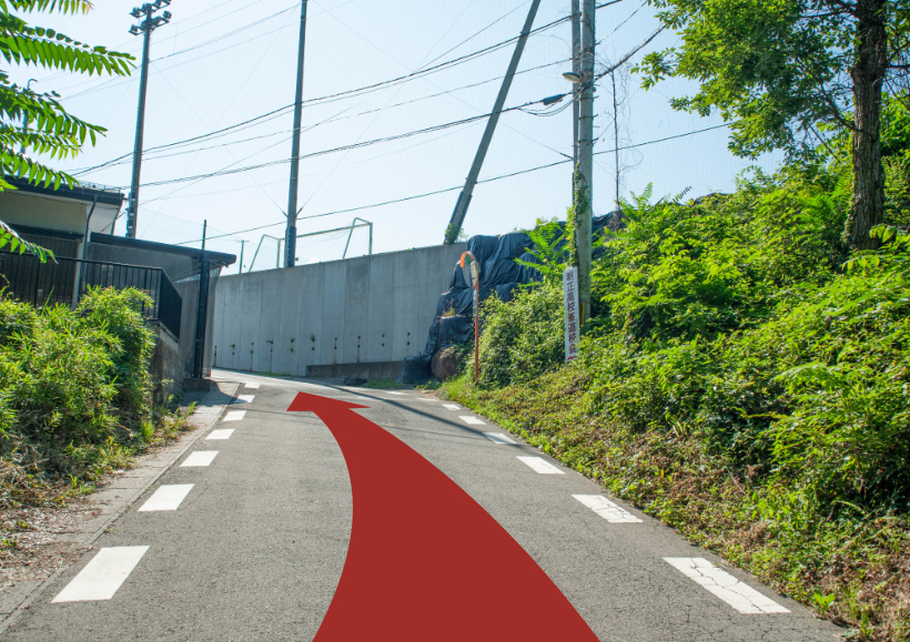 7.峯道をのぼっていくと、左手にゴミ収集用の小屋が見えます。Y字路になっていますので、右側へお進み下さい。山形明正高校の看板が見えます。