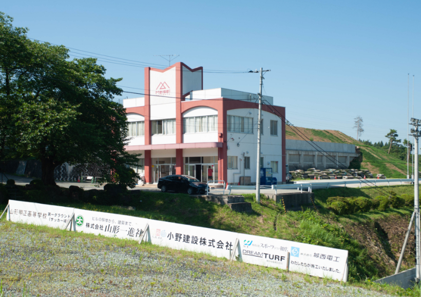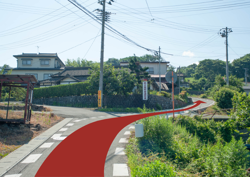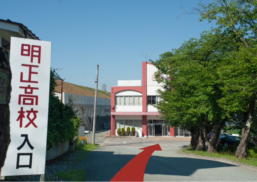 6.一時停止の看板のところで左折してください。山形明正高等学校峯道校舎の看板が見えます。